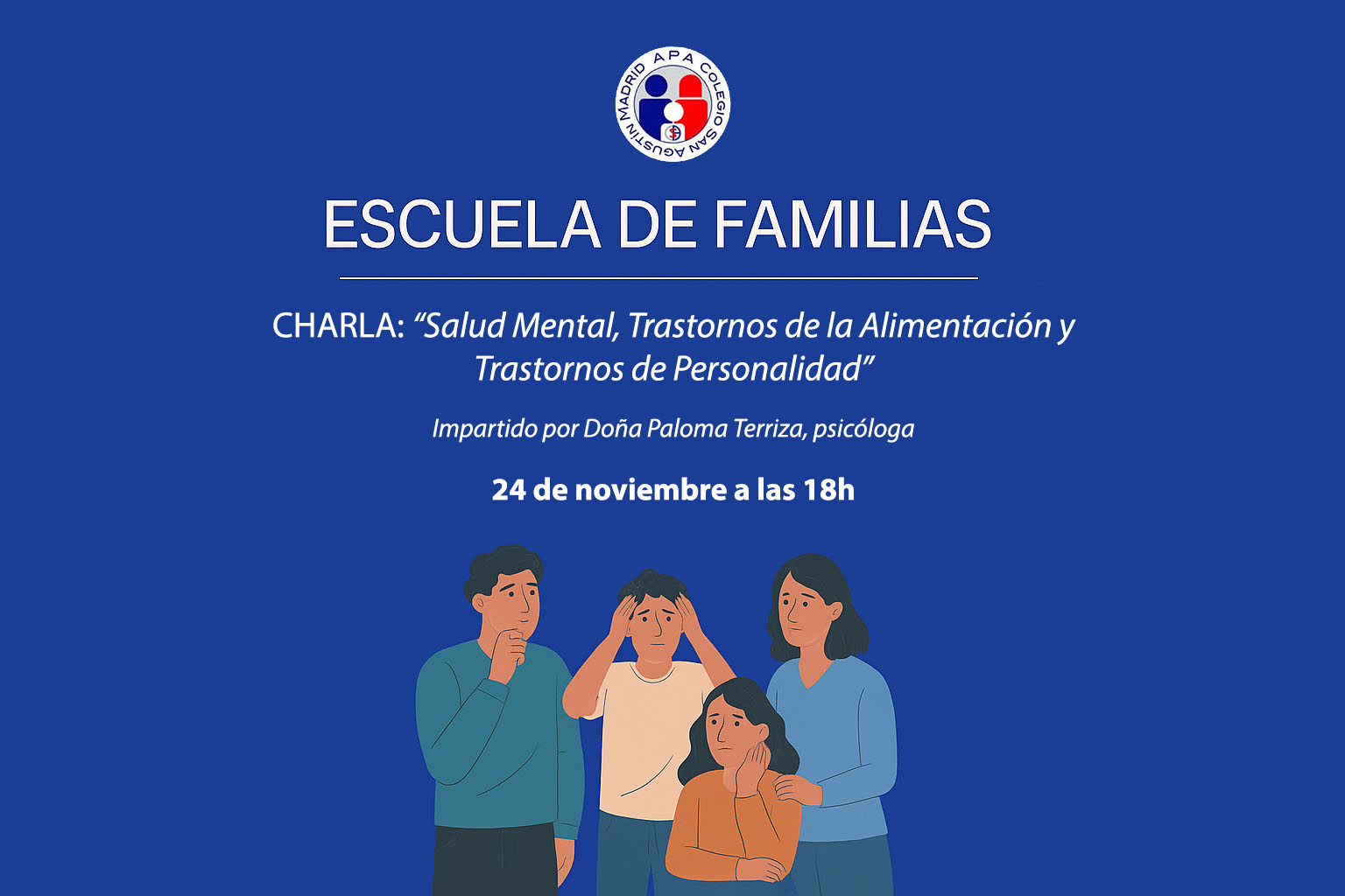 Desde la ESCUELA de FAMILIAS del Colegio “San Agustín” que realizamos el DEPARTAMENTO DE ORIENTACIÓN en colaboración con la APA, queremos ponernos en contacto con vosotros, para informaros que vamos a tener una Escuela de Familia sobre un tema de plena actualidad, Salud Mental, Trastornos de la Alimentación y Trastornos de Personalidad.
