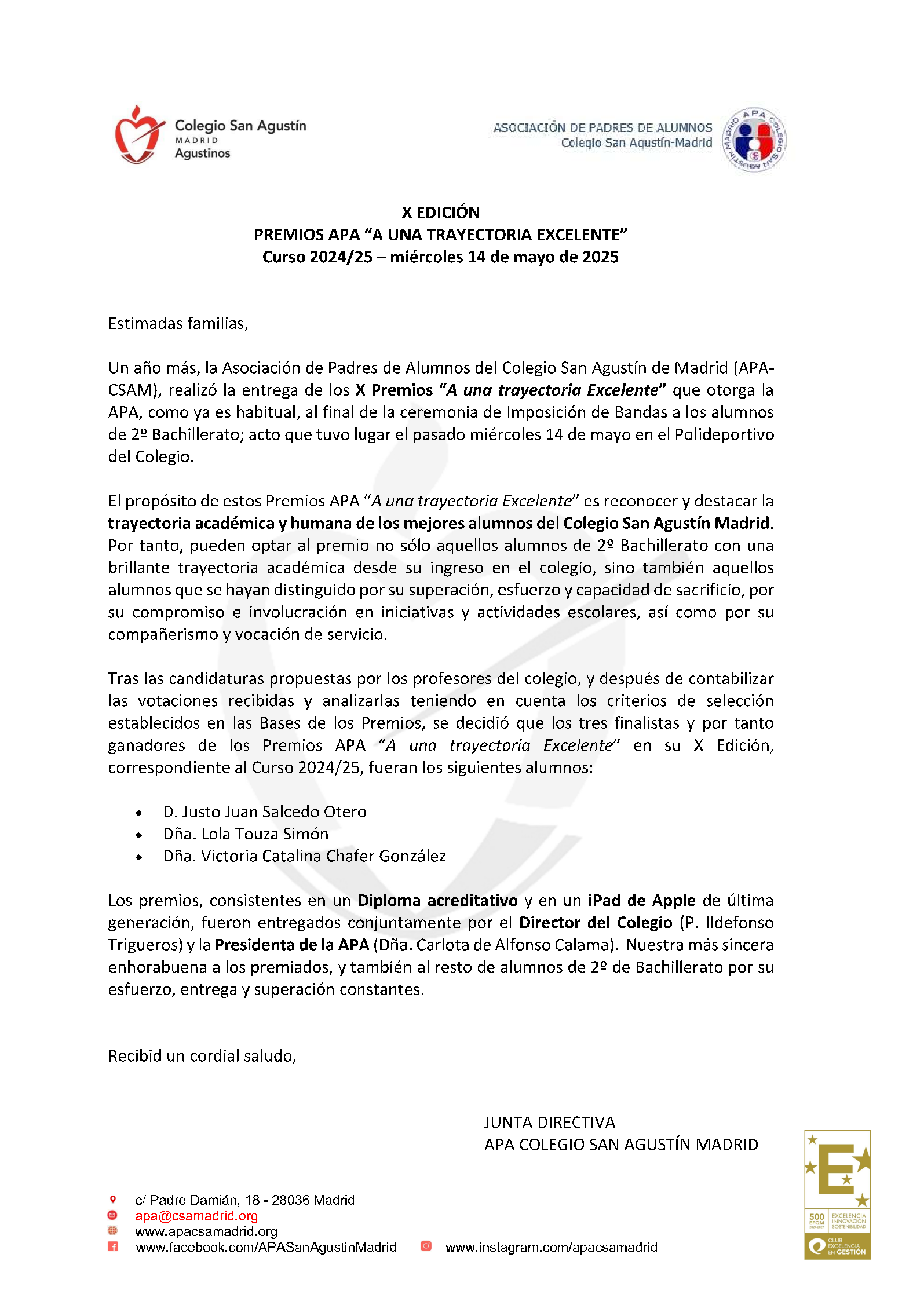 PREMIOS APA “A UNA TRAYECTORIA EXCELENTE” Curso 2024/25